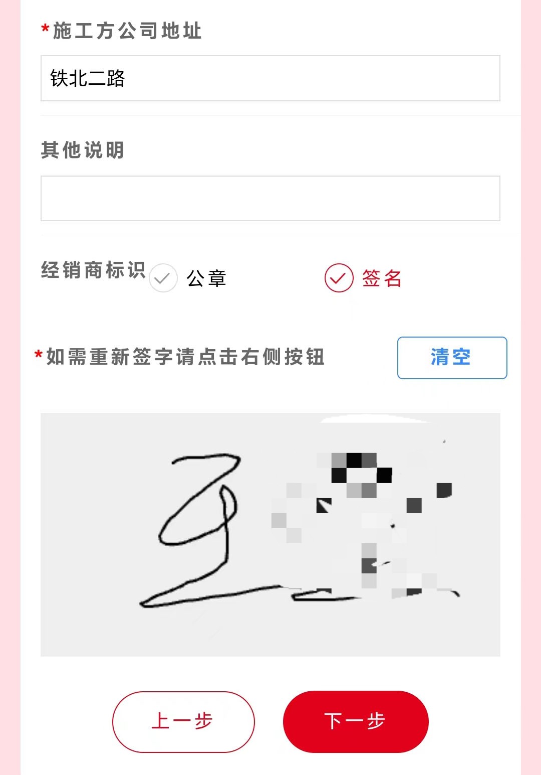 经销商标识可选择公章,也可选择签名,名字写错可点击清空。