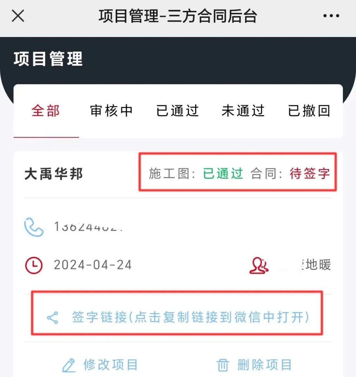 施工图/合同审核通过后,将签字链接点击复制,通过微信发给客户签字,签字后合同生效,如需查看合同内容,可点击合同下载。