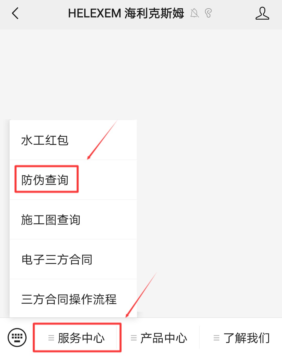 02.进入公众号,点击左下方服务中心→防伪查询